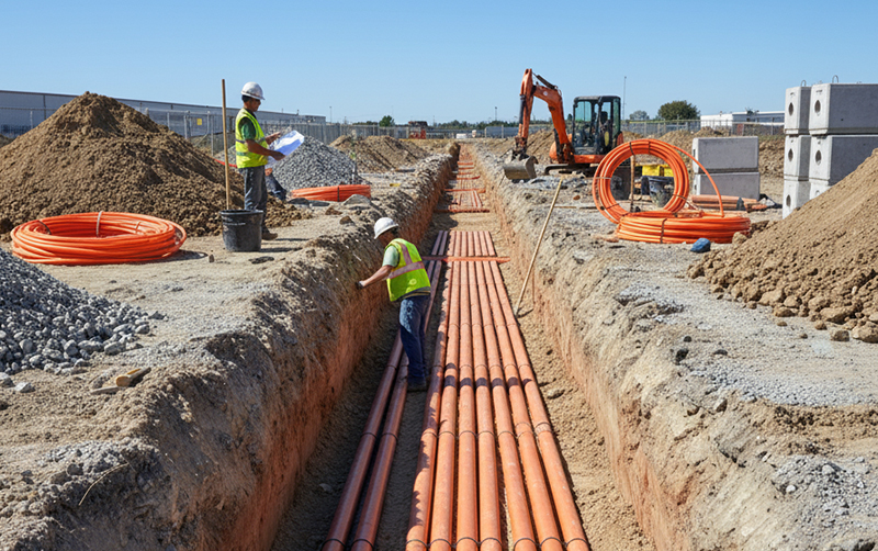 Preparación de terreno / Zanjas y ductos eléctricos / Construcciones de albañilería / Construcción modular eco eficiente